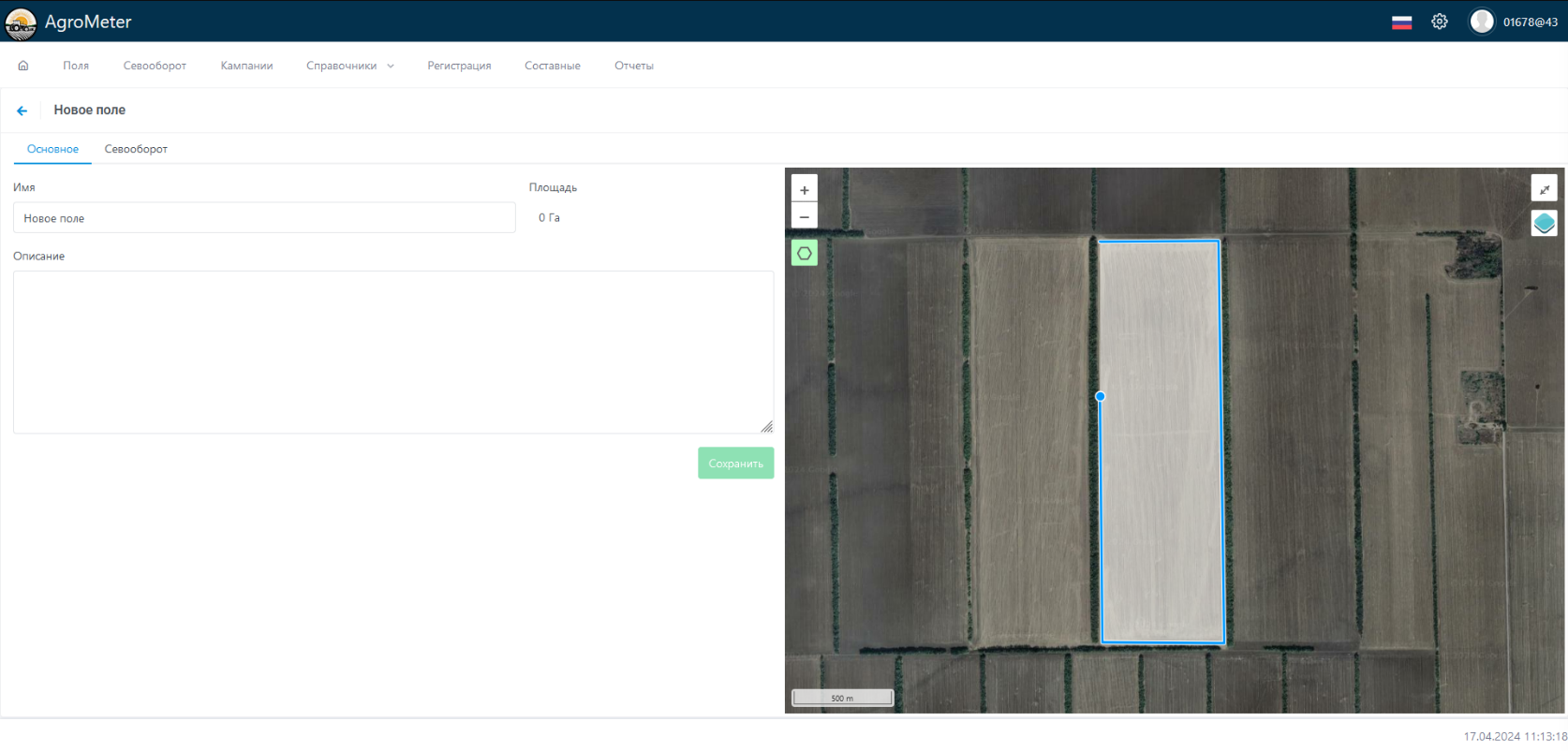 3. Нажмите на кнопку (Нарисовать поле) и укажите границы поля на карте. После этого справа от имени поля показывается его площадь в гектарах.