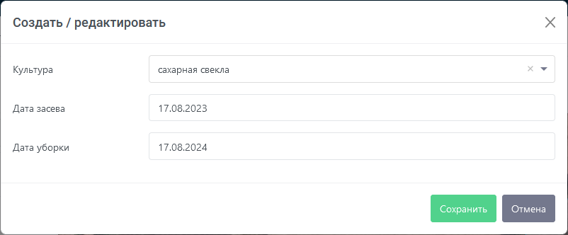 В качестве даты посадки автоматически указывается 1 января текущего года, даты уборки — 31 декабря текущего.