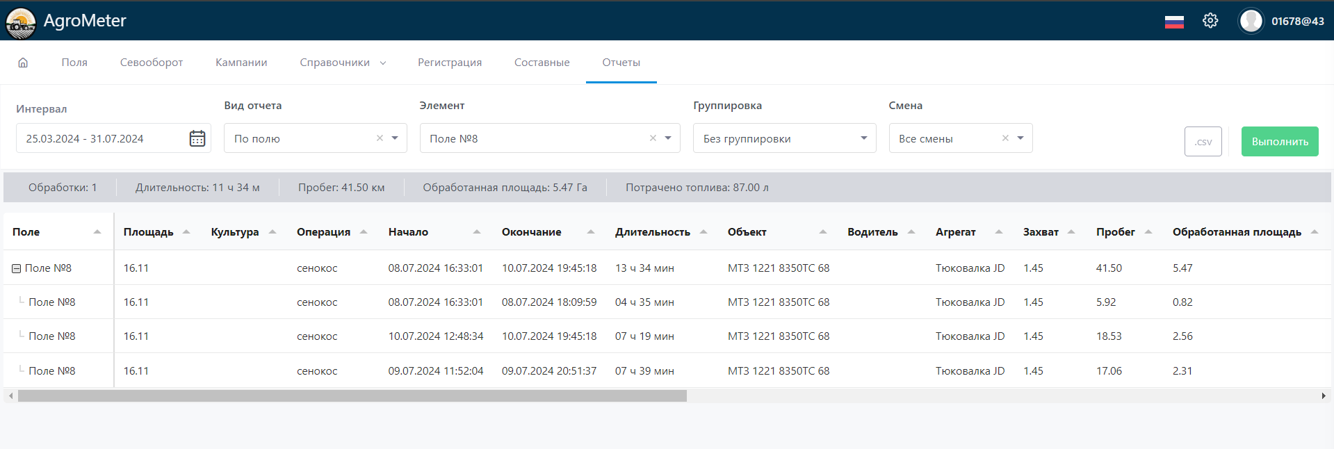 Составная обработка показывается в отчете, если хотя бы один из дней, в которые она выполнялась, относится к интервалу отчета. В отчетах По объекту и По водителю составные обработки не показываются. Они также не показываются, если в отчете применяется фильтрация по смене. Если используется группировка, то составные обработки показываются только при группировке по культуре и по операции.