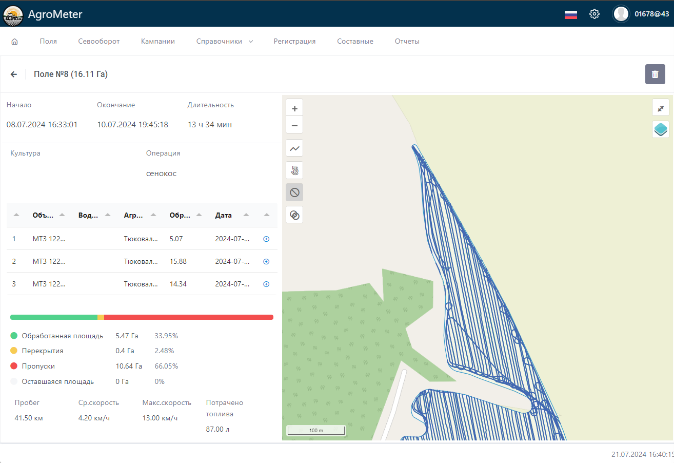 На этой странице приложения можно получить отчет с подробной информацией о проведенных на поле работах. Отчет строится на основании подтвержденных обработок.